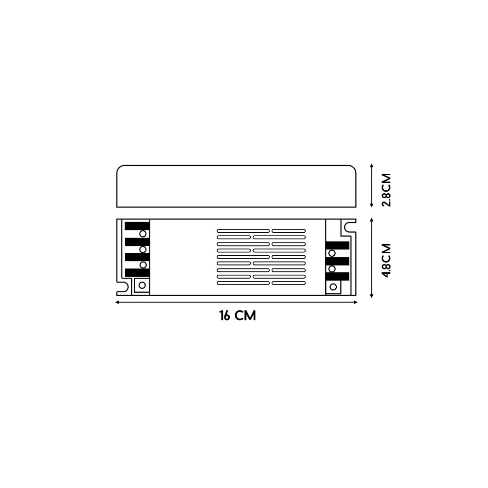Con soli 160×48×28mm, questo alimentatore strisce LED 24V è appena 18mm più lungo del 60W ma con quasi il doppio della potenza. Posizionalo in un punto ventilato e accessibile per la manutenzione, mai in spazi completamente chiusi senza areazione. Le posizioni migliori: sopra i pensili della cucina, dentro il cassettone del controsoffitto, nel vano del mobile TV, dietro una mensola, in un mobiletto aperto sul retro. Il corpo in alluminio dissipa il calore naturalmente senza ventola: niente ronzio, completamente silenzioso. Solo per ambienti interni asciutti.