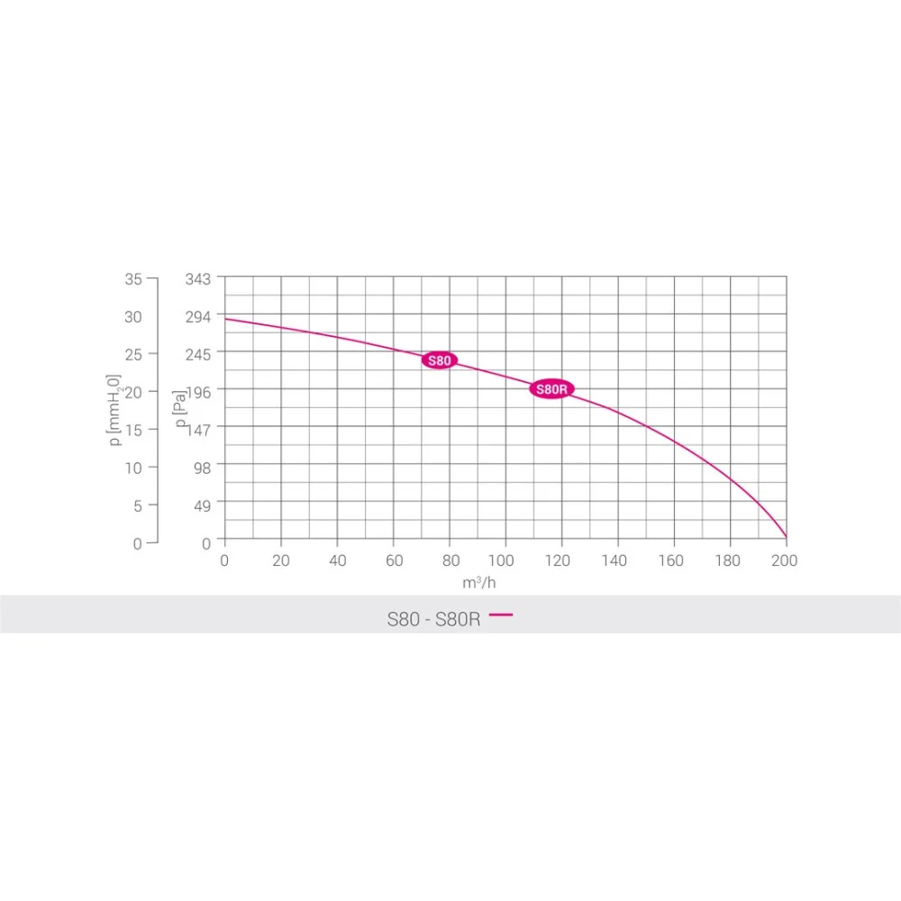 L'aspiratore bagno senza tubo S80R usa un motore centrifugo, non assiale. Cosa cambia? Il centrifugo genera più pressione e muove più aria anche attraverso i filtri che oppongono resistenza. La portata di 200 metri cubi all'ora garantisce un ricambio efficace anche in locali fino a 25m³. Gli aspiratori assiali economici perdono metà della portata quando devono spingere l'aria attraverso un filtro.