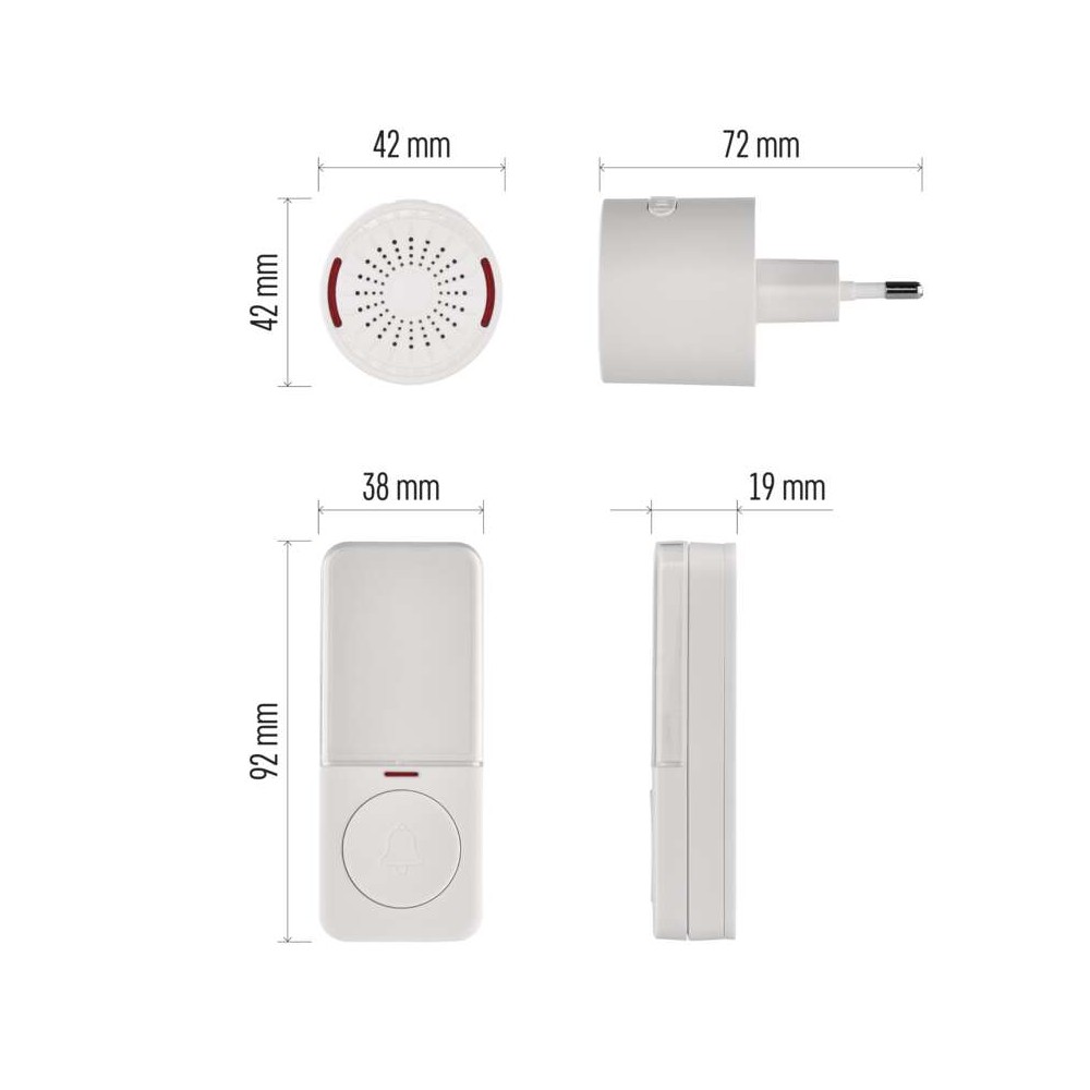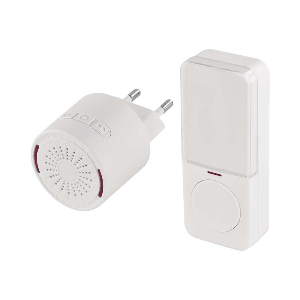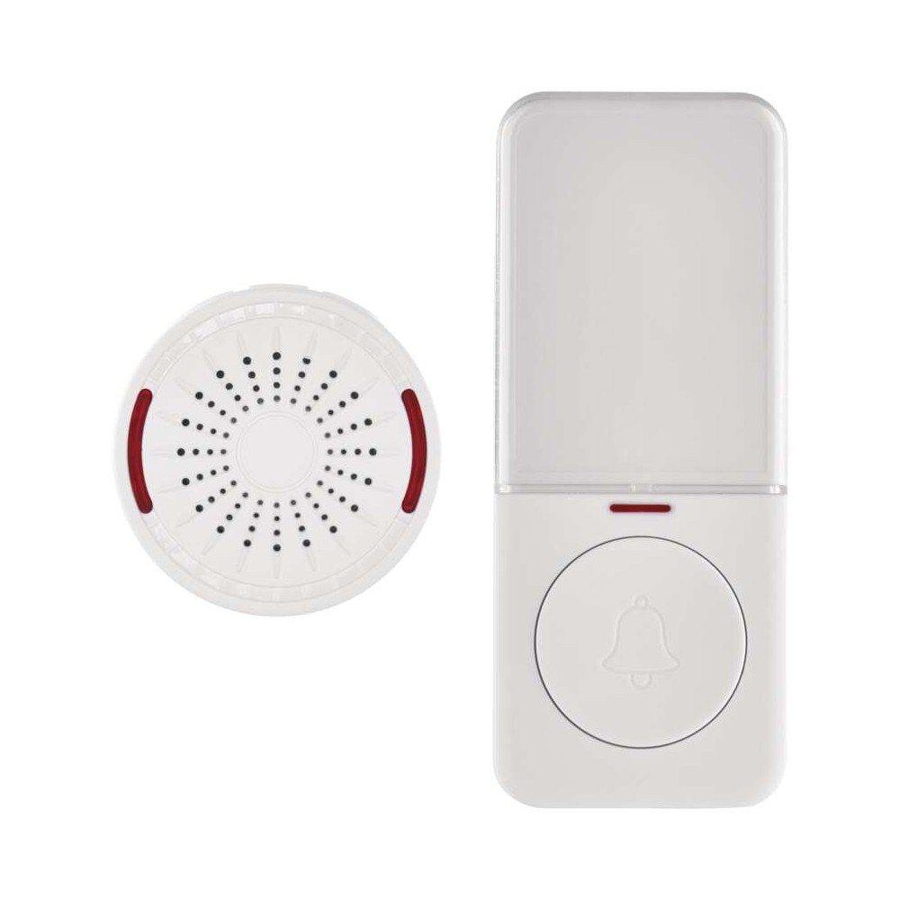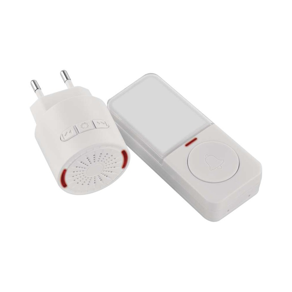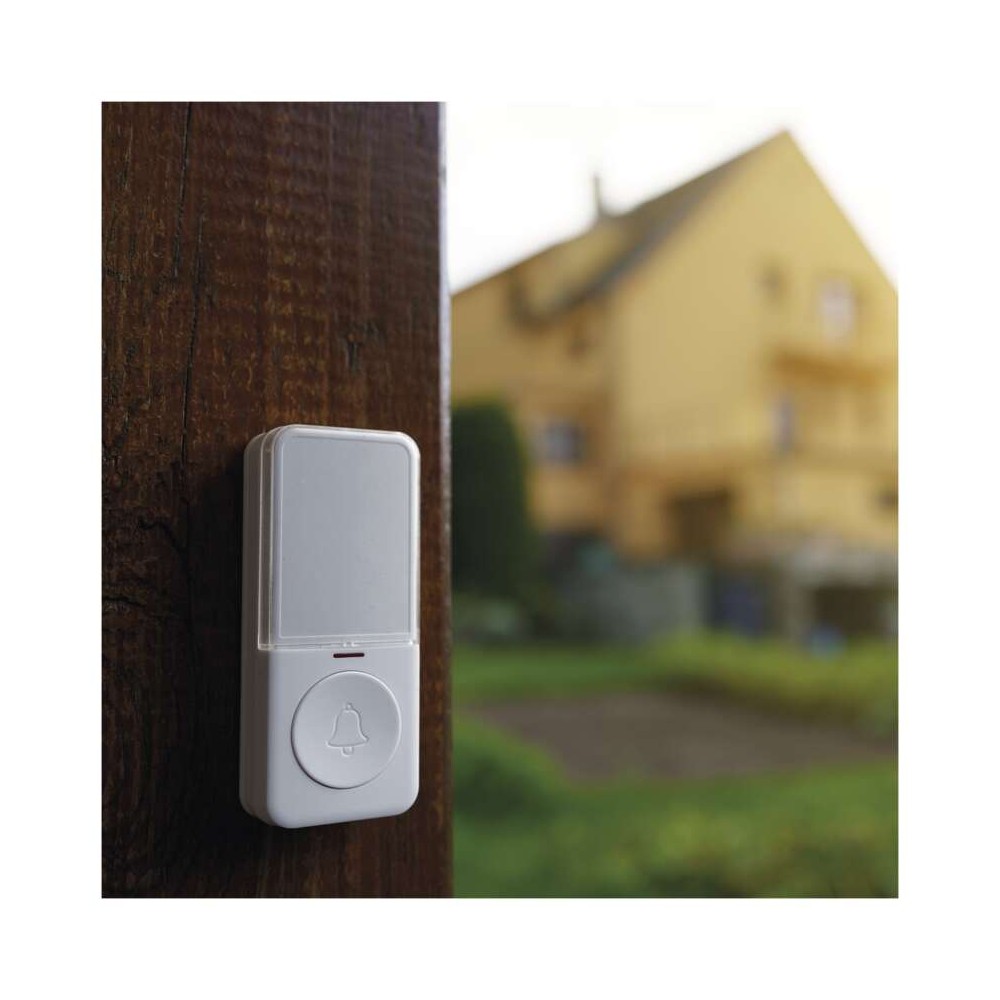 Il ricevitore si collega direttamente a una presa 230 V e integra una luce LED che segnala ogni chiamata. Il pulsante wireless IP56 è impermeabile e funziona con batteria CR2032 inclusa, così puoi posizionarlo anche all’esterno senza preoccupazioni.