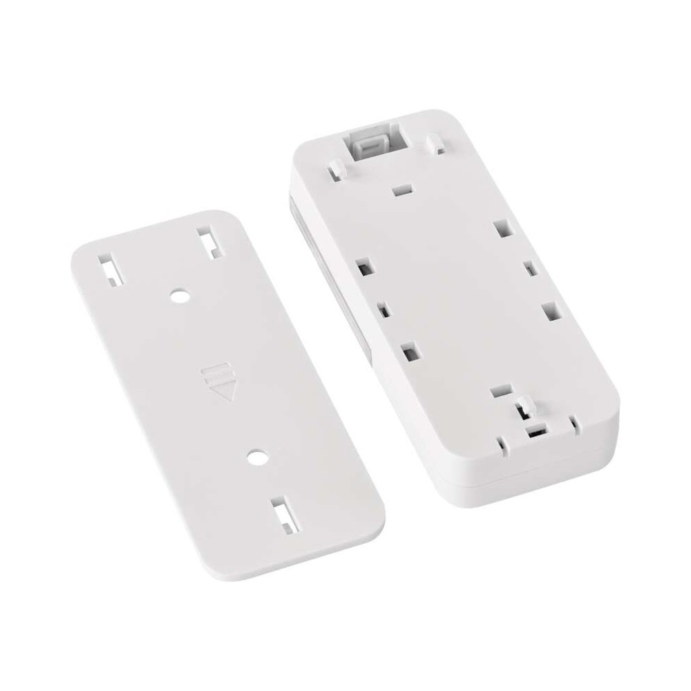 Il ricevitore si collega a una presa 230 V, il pulsante IP44 è impermeabile e alimentato da batteria CR2032 inclusa. Nessun cavo da tirare: installazione immediata e autoapprendimento in pochi secondi.