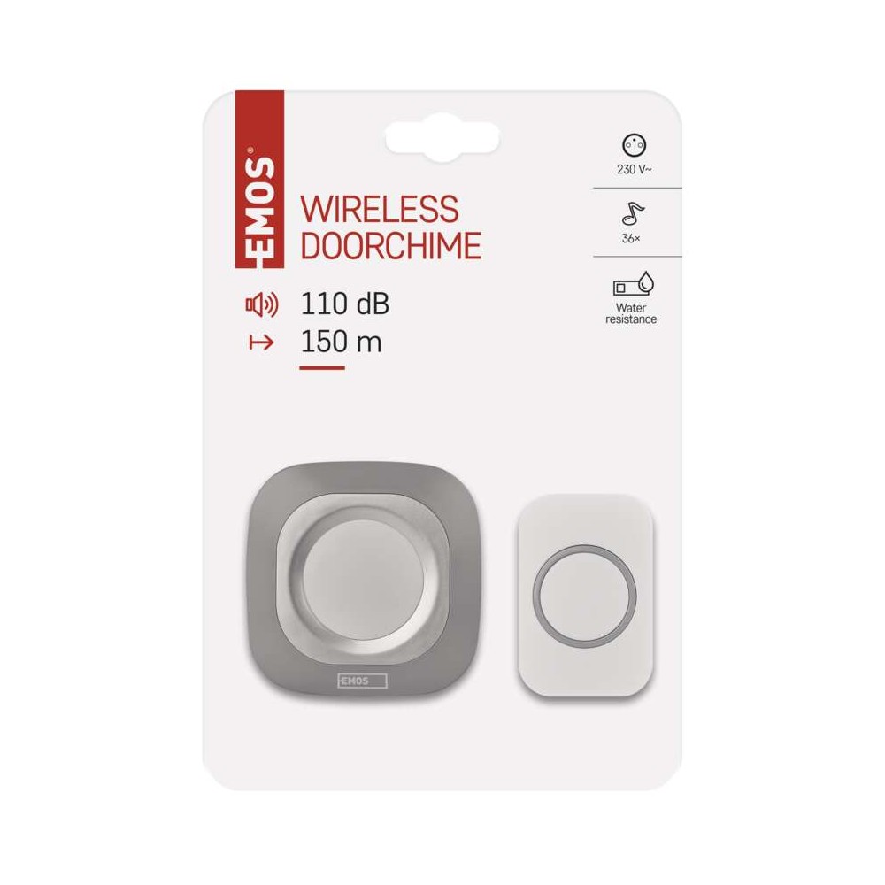 Campanello Senza Fili Quadrato Argento | Luminoso 150mt, 110dB, 36 Melodie | EMOS P5733S