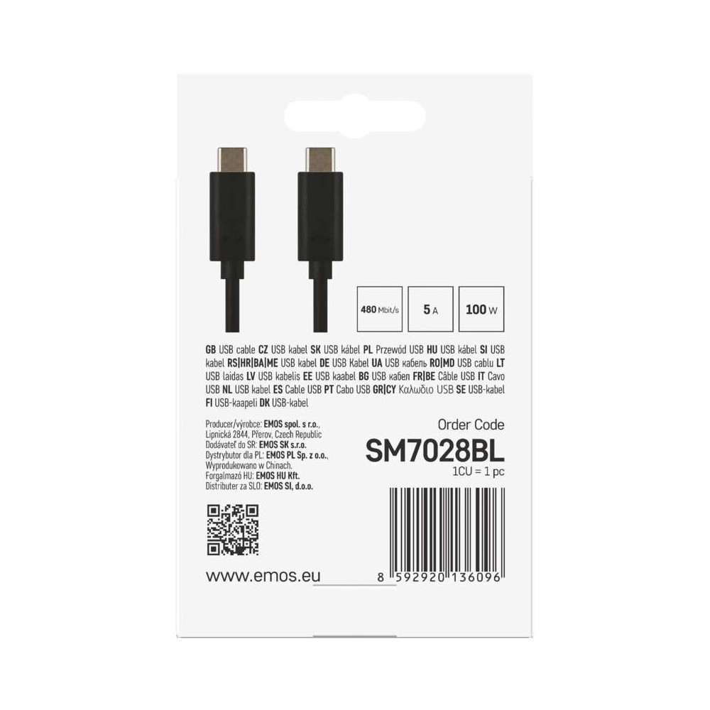 Cavo USB-C 1m 100W a USB-C Nero – Ricarica e Dati | EMOS SM7028BL