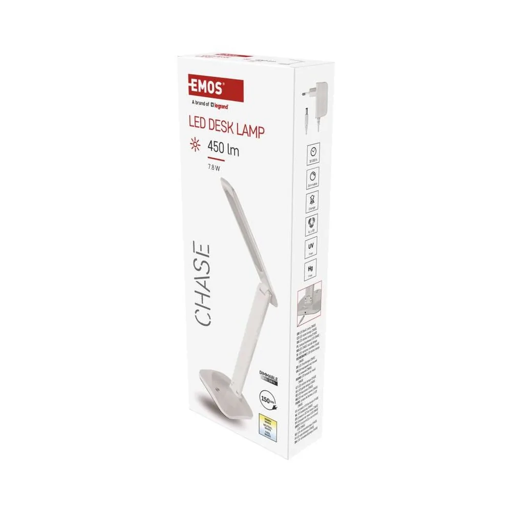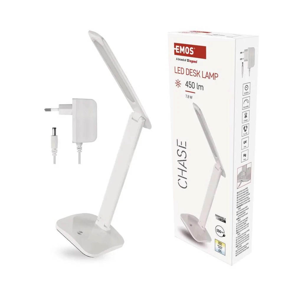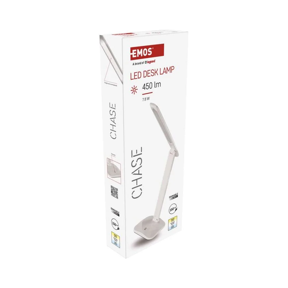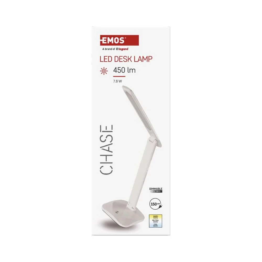 La lampada da tavolo LED dimmerabile EMOS CHASE Z7619W ha flusso luminoso 450 lumen, consumo 7,2W, 3 temperature colore selezionabili (2700K/4000K/6500K), dimmerazione continua, CRI >80, alimentazione 220-240V, cavo 1,5 metri, durata 30.000 ore, dimensioni 370×340mm, colore bianco. Alimentatore incluso. Certificazione CE.