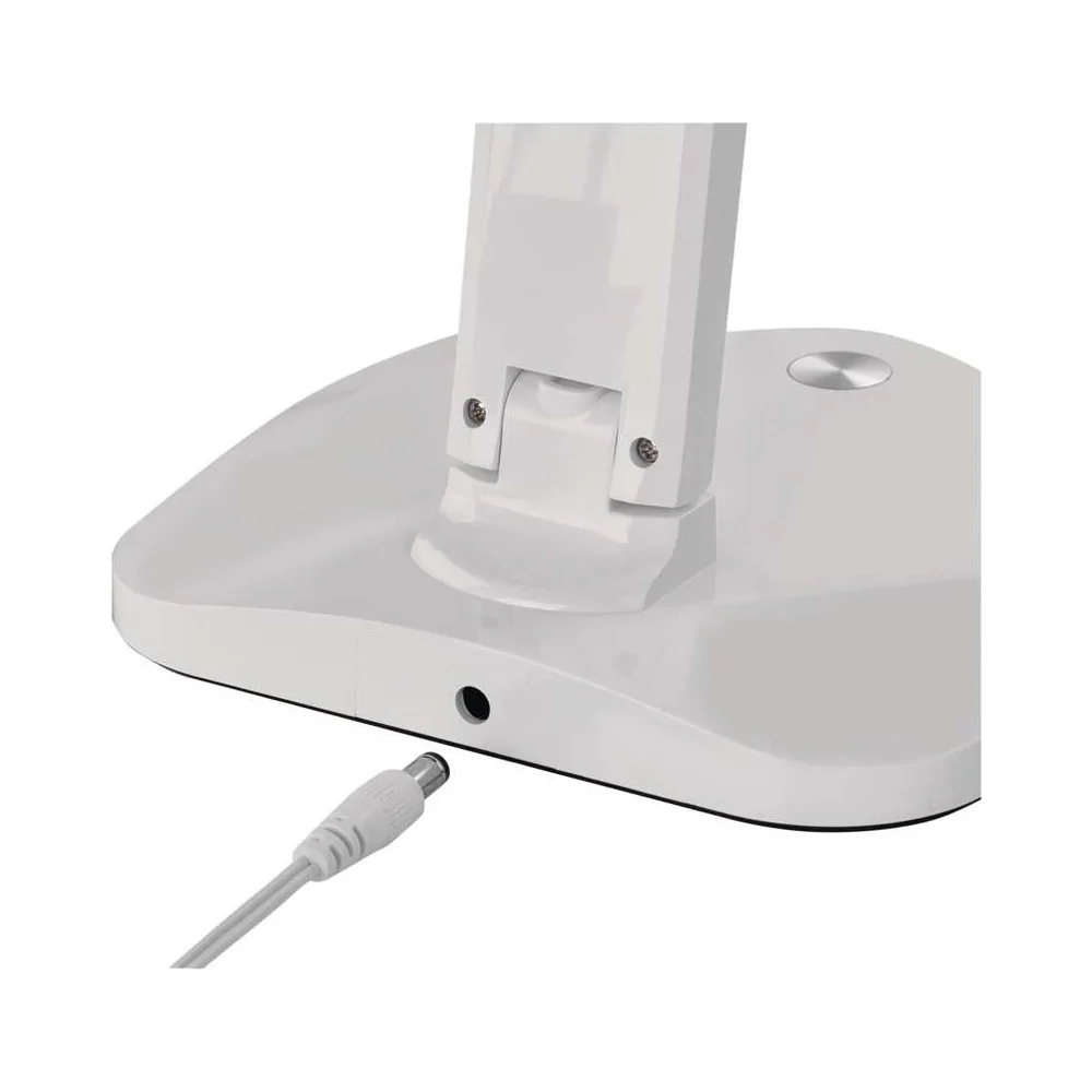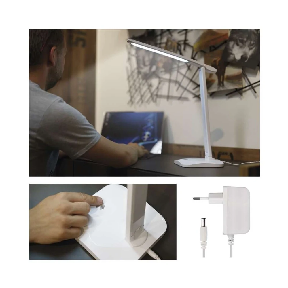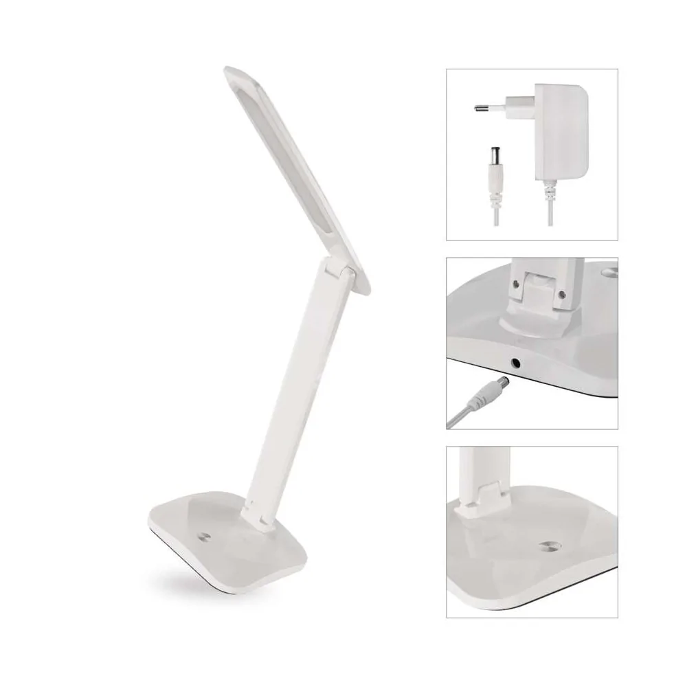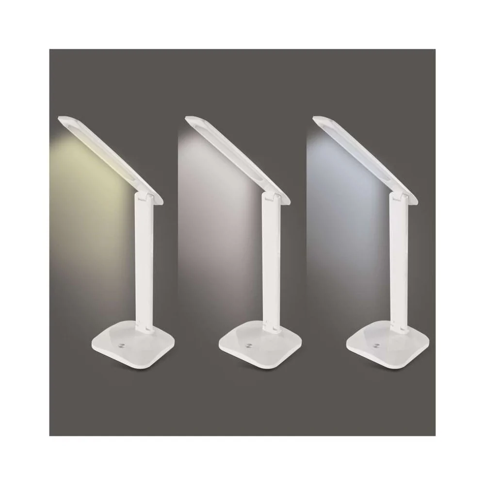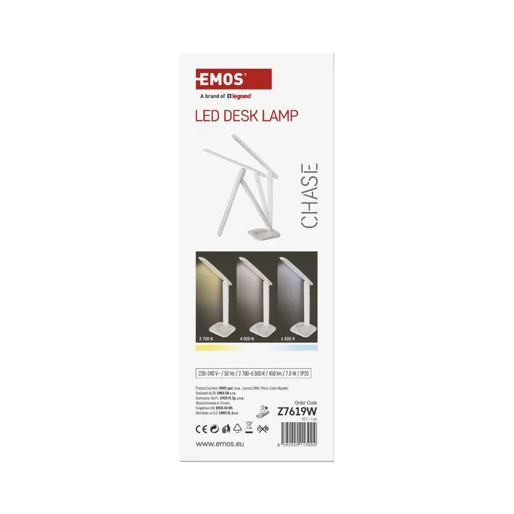 La lampada da tavolo LED dimmerabile EMOS CHASE Z7619W ha flusso luminoso 450 lumen, consumo 7,2W, 3 temperature colore selezionabili (2700K/4000K/6500K), dimmerazione continua, CRI >80, alimentazione 220-240V, cavo 1,5 metri, durata 30.000 ore, dimensioni 370×340mm, colore bianco. Alimentatore incluso. Certificazione CE.