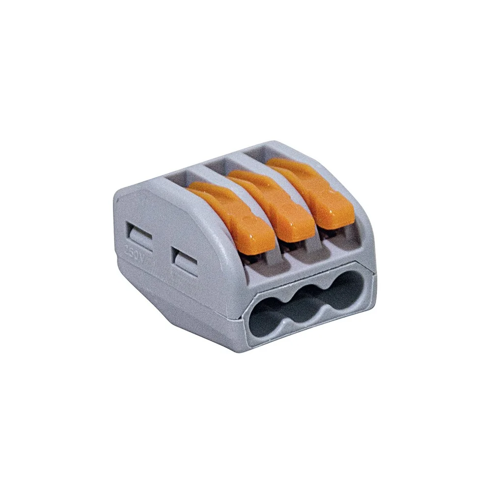 Il funzionamento del connettore rapido 3 cavi è semplicissimo. Spela ogni cavo per circa 10mm, alzi la leva arancione corrispondente, inserisci il conduttore nel foro fino in fondo, abbassi la leva. Una molla interna blocca il cavo garantendo contatto elettrico perfetto. Il collegamento non si allenta nel tempo e puoi verificarlo visivamente attraverso il corpo semitrasparente. Questo connettore è completamente riutilizzabile: apri, sfili, ricolleghi quante volte vuoi.