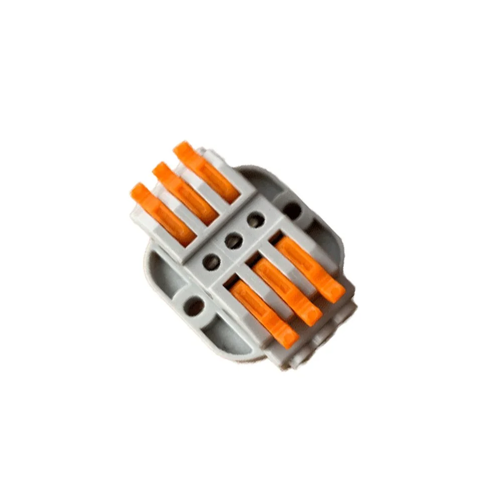 Il funzionamento del connettore in linea 3 cavi è semplicissimo e non richiede attrezzi. Spela i cavi per circa 10mm, alzi le leve arancioni, inserisci i conduttori nei fori corrispondenti, abbassi le leve. Una molla interna blocca ogni cavo garantendo contatto elettrico perfetto. Il collegamento non si allenta nel tempo e puoi verificarlo visivamente. Questo morsetto passante è completamente riutilizzabile: apri, sfili, ricolleghi quante volte vuoi.