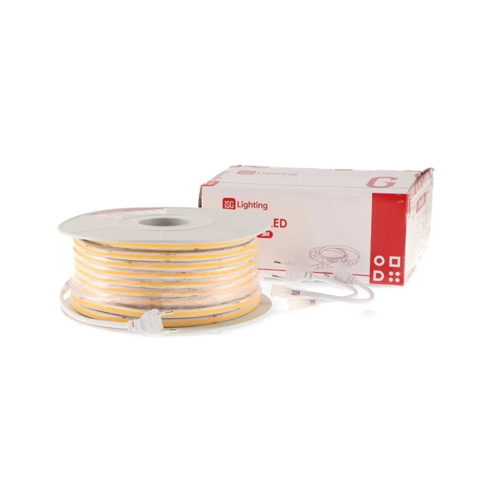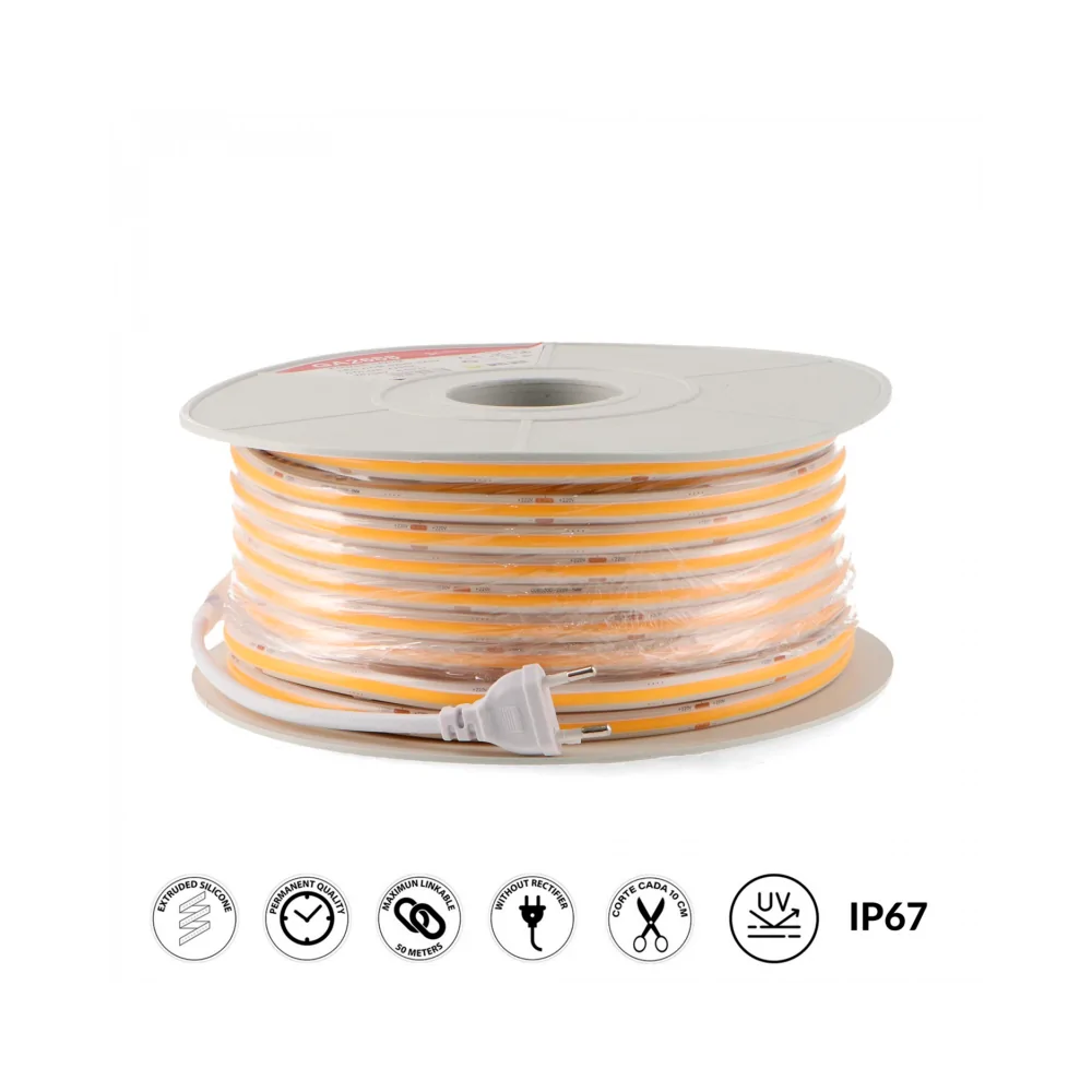 Cerchi una luce lineare senza punti visibili? La striscia LED COB 220V LEDME GA2687 si collega direttamente alla rete elettrica senza trasformatore. Luce calda 3000K, perfetta per atmosfere accoglienti. Grazie alla protezione IP67 puoi installarla in terrazzo, giardino, ma anche in bagno intorno allo specchio, sopra i mobili della cucina o in qualsiasi ambiente umido. Tecnologia COB: luce uniforme e continua. Potenza 14W/m, 1650lm/m, CRI90. Dimmerabile TRIAC, taglio ogni 10cm. Garanzia 3 anni. Per collegare la striscia LED COB 220V puoi saldare i cavi oppure usare il cavo GA0084 con clip. Prezzo al metro: scegli la quantità e ordina i metri che ti servono! Scegli la striscia LED COB 220V 3000K!